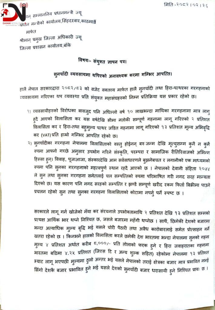 सोमबार सुनचाँदी व्यवसायी आबद्ध विभिन्न संघ, संगठनहरुले संयुक्त रुपमा जिल्ला प्रशासन कार्यालय बाँके मार्फत प्रधानमन्त्रीलाई ज्ञापन बुझाएका हुन् ।