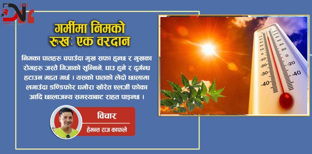 गर्मी मौसम आउने बितिक्कै जीवनमा अनेकौ परिवर्तन देखिन्छ । मुख्यतया नेपालको तराई क्षेत्रमा गर्मी केवल मौसम होइन एक गहिरो अनुभव हो शरीरलाई पोल्ने मनलाई थकित बनाउने तर जीवनको यथार्थ दर्शाउने समय पनि हो । नेपालगन्जजस्तो सहरमा जहाँ तापक्रम ४४ डिग्री सेल्सियसभन्दा माथि पुग्न सक्छ गर्मीलाई सहन सक्नु सजिलो काम होइन । सडक धुलाम्य छन तातो लु चलेकै छ । बिधालय गएका विद्यार्थीका कपडा भिजेका छ्न । पानीका श्रोतहरू सुक्दै छ्न पानीको हाहाकार बिजुली कटौतीले जनजीवन निकै दुखित । चरा अन्य जिवहरू छाँयाको खोजीमा हिँड्छन् कहिले चौरफेरोको बुट्टे रुखमुनि कहिले पसलको जस्ताले ओढेको छायाँमा । गाउँ घर तिर खरको छानो यस्तै घाम धुलो र पसिनाको कहालीलाग्दो दुनियाँमा एउटा हरियो आशा बन्छ निमको रुख । गर्मीमा निमको शीतलताबीचको सम्बन्ध केवल प्राकृतिक होइन मानवीय जिबन उपयोगी सङ्ग संबंधित छ ।