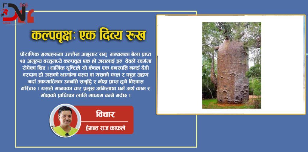 कल्पवृक्ष जसलाई वैज्ञानिक भाषामा ब्मबलकयलष्ब र अङ्ग्रेजीमा द्यबयदबद तचभभ भनिन्छ । सामान्यत यो अफ्रिकी मूलको विशेष रूख हो जुन आफ्नो असामान्य बनोट दीर्घ आयु र औषधीय गुणका कारण विश्वभर परिचित छ । हिन्दू धर्ममा भने यस वृक्षलाई एक पवित्र दिव्य र इच्छा पूर्ति गर्ने वृक्षको रूपमा लिईन्छ । कल्प शब्दको अर्थ हुन्छ इच्छा वृक्ष को अर्थ रूख यसरी कल्पवृक्ष भन्नाले इच्छा पूर्ति गर्ने वृक्ष जनाउँछ ।