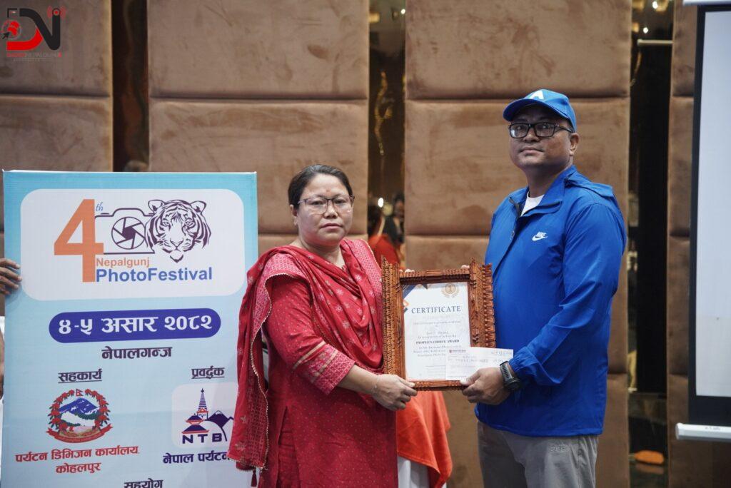 यस्तै समापन कार्यक्रममा नेपालगन्ज १८ का तिलक गाहा मगरले खिचेको तस्बिरले खेलकुद विधामा उत्कृष्ट हुँदै लुम्बिनी प्रदेश सभा सदस्य पुनबाट अवार्ड र पुरस्कार राशी प्राप्त गरेका छन् । कृषि विधामा बबी साई, संस्कृति विधामा सञ्जय महर्जन, दैनिक जीवन विधामा विजय थापा, प्रकृति र संरक्षण विधामा रोमिन थारु, नेपाल स्माईल विधामा जीवन लामा, वाईल्ड लाइफ विधामा विनय रावल, टुरिजम विधामा मनोज पौडेल र न्युज विधामा बरम बुढाका तस्बिर विधागत उत्कृष्ट भएका छन् । विधागत उत्कृष्ट तस्विरको पुरस्कार राशी ५÷५ हजार रुपैँया रहेको थियो ।