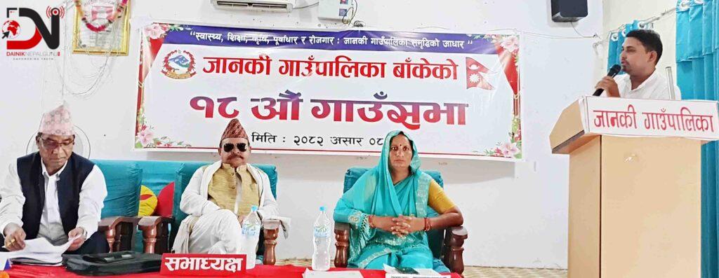 ²स्वास्थ्य, शिक्षा, कृषि, र पूर्वाधारः जानकी गाउँपालिकाको समृद्धिको आधार’ भन्ने नाराका साथ गाउँसभा सुरु भएको गाउँसभामा प्रस्तुत नीतिमा युवा स्वरोजगार कार्यक्रम गर्ने, कृषक अनुदान कार्यक्रम संचालन गर्ने, स्थानीय उत्पादनहरूको बजारीकरण गर्ने, पशु अस्पताल बनाउने, पशुहरूलाई निःशुल्क खोप लगाउने विषयमा जोड दिइएको छ ।
