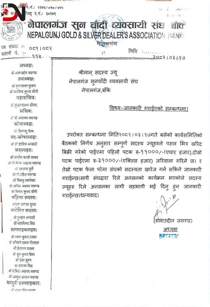बन्दका समयमा सुनचाँदीको गहनाको कारोबार गरेको पाइएमा पहिलो पटक ११ हजार, दोस्रो पटक ३१ हजार जरिवाना गर्ने उल्लेख गर्दै नेपालगन्ज सुनचाँदी व्यवसायी संघ बाँकेले तेस्रो पटक पनि संघको निर्णय नमान्ने सदस्य व्यवसायीको सदस्यता खारेज गर्ने चेतावनी दिएको छ ।