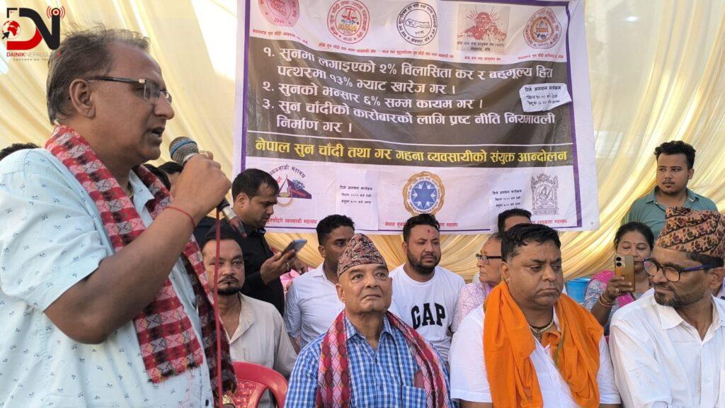 नेपाल सरकारद्वारा लागू गरिएको अव्यवहारिक कर नीतिको विरोधमा नेपाल सुनचाँदी व्यवसायी महासंघ र नेपाल सुनचाँदी रत्न तथा आभूषण महासंघ संयुक्तरूपमा आन्दोलनमा उत्रिएका छन् ।