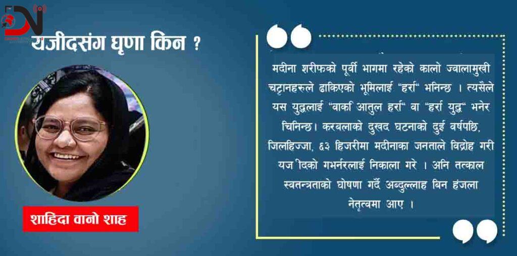तर यज़ीदका समर्थकहरु करबलाको युद्ध, हर्राको युद्ध र मक्काको घेराबन्दी जस्ता घटनाहरूको यर्थातलाई ढाकछोप गरिरहेकाछन् । मानौं ती घटना कहिल्यै भएनन् । माथिका घटनालाई मनन गरी तपाई आफै सोच्नुस्, यजीद कति दुष्ट थियो । यज़ीदले केवल अहलेबैतलाई मात्र होइन् , उसले त सम्पूर्ण उम्मतको आत्मालाई नै छियाछिया पारेकोथियो । अहलेबैतसँग माया राख्नु सत्यसंग उभिनु हो जबकि यजीदको समर्थन गर्नु कति नाजायज हो यो भन्नै पर्दैन् । करबला, हर्रा र मक्का घेराबन्दी केवल इतिहास होइनन् । करबल र हर्रा जस्ता घटना त्यो ऐना हो, जसमा ती सबै अनुहार देखिन्छ जो यजीद जस्तो अत्याचारी र दुष्टको पक्षमा उभिएका थिए । अब त यज़ीदको बचाउ गर्दा लाज लाग्नेछ होला । अब पनि यजीदको समर्थन गर्नु रसूलुल्लाह ﷺ र अहलेबैत भन्दा यज़ीदलाई प्रिय ठान्नु हो ।
