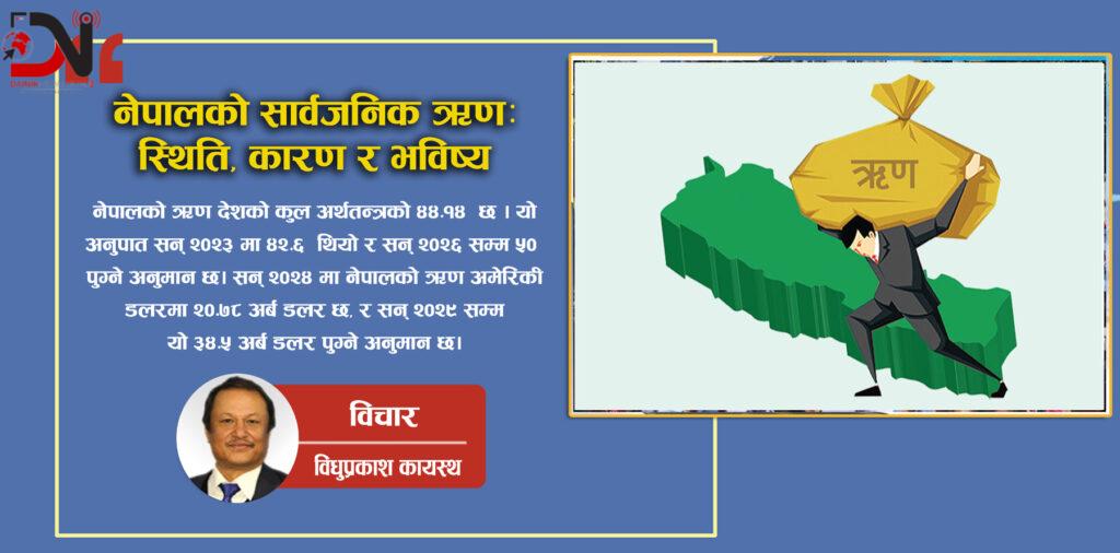 नेपालको सार्वजनिक ऋण सन् २०२४ मा GDP को ४४.१४% छ र सन् २०२६ सम्म ५०% पुग्ने अनुमान छ। रेमिट्यान्स र सस्तो बाह्य कर्जाले नेपालको ऋण जोखिम कम छ, तर सरकारी कम्पनीहरू, बैंकहरूको समस्या, र बाह्य जोखिमहरूले सावधानी अपनाउनुपर्छ। कर सुधार, निर्यात वृद्धि, र राम्रो ऋण व्यवस्थापनले नेपालले आर्थिक स्थिरता कायम राख्न सक्छ।