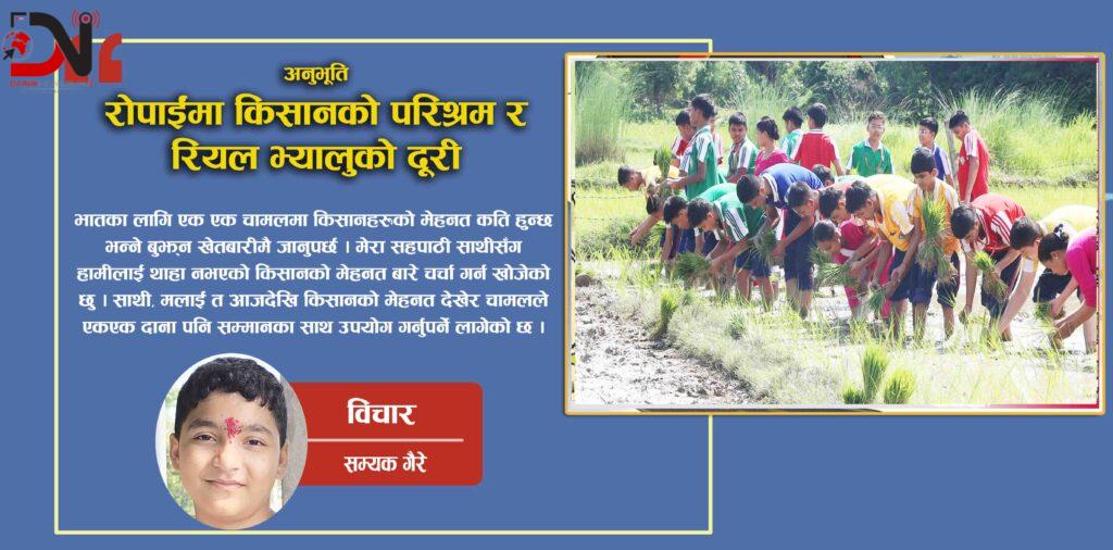 खासमा म सोफिया रेसिडेन्सियल स्कुलको विद्यार्थी हुँ । लेख्न सिक्दैछु । हिजो हामी मेरो विद्यालयबाट धान रोपाई कार्यक्रममा गएका थियौं । जुनकि हाम्रो विद्यालयले हरेक वर्ष लैजान्छ । तर, हामीले योपाली रोपाई गर्न जाँदा धेरै समय बिताएनौँ । र, यो दिनको कुराले मलाई किसानहरूको मेहनत हेरेर मलाई एउटा विचार आयो । त्यो विचार लेख्न मन लागेकोले कोशिश गरेको हुँ ।