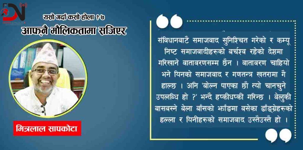 नेपाली जनताले बुझेको समाजवाद त वास्तविक समाजवाद हो । जुन नेपालको मौलिकतामा थियो । जहाँ संयुक्त परिवार थियो । गाउँभरिमा अैंचोपैचो जिवन्त थियो । अतिथिको सम्मान थियो । हरघरमा आफ्नो आवश्यकताको लागि आफै उत्पादन गर्नुपर्छ कसैसँग बेसाएर ल्याएर खाँदा आफ्नो इज्जत रहँदैन भन्ने मान्यता थियो । नातापाता सम्बन्धमा दर्जानुसारको सम्मान र सम्बोधन थियो । धर्म, नैतिकताको परम्पराले समाजलाई कडा अनुशासनमा बाँधेर राखेको थियो । शिक्षा निशुल्क थियो । मानव जिवनको उमेर समूहलाई बिभिन्न चरणमा बाँडेर कहिले कुन उमेरमा के गर्ने भन्ने सटिक योजना र प्रयोग थियो । प्रकृति वर्तमान पुस्ताको मात्रै पेवा होइन यसलाई बचाउनुपर्छ र आफ्ना भावी सन्ततिले पनि उपभोग गर्न पाउनुपर्छ भन्ने समाजिक मान्यता थियो । मानवको रक्त शुद्धताको लागि कुलको र प्रकृतिको शुद्धताको लागि मुलको रक्षाको जिम्मा समाजलाई नै थियो । जल जमीन र जङ्गलको रक्षाको लागि हावा गफ होइन व्यवहारिक ज्ञान सीप र त्यसको कडाइका साथ उपयोग थियो । गाउँमा कोहि भोको हुँदा मिलेर खुवाउने चलन थियो । समाजिक कर्महरू गर्दा सम्पूर्ण गाउँ नै मिलेर त्यसलाई सम्पन्न गर्ने चलन र व्यवहार थियो । पराइलाई घरगाउँभित्र पस्न बस्न र मनपरि गर्ने छूट थिएन । आफ्नो गोपनियतालाई आफैसँग राख्ने नीति र नैतिकता थियो । उब्जाउ जमीनलाई जोत्ने र बन्जरलाई पोत्ने थिति थियो । काम बीना माम लिनु पाप मानिन्थ्यो । त्यहाँ वास्तवमा नै समाज थियो अनि समाजवादको उत्कृष्ट प्रयोग थियो ।