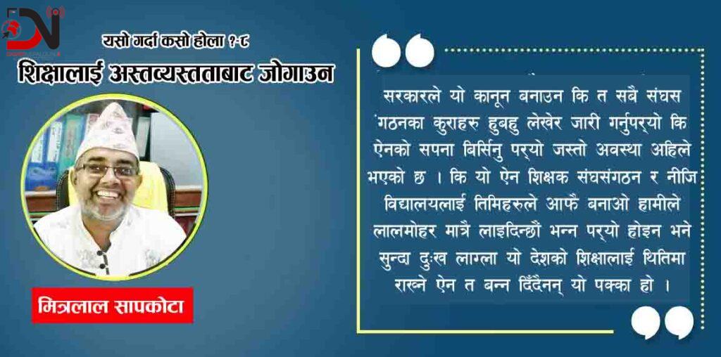 यदि कुनै देशलाई बर्बाद गर्नु छ भने त्यो देशको शैक्षिक क्षेत्रमा अस्तव्यस्तता ल्याए पुग्छ । नेपालमा यहि दशा भएको छ । हो अलिकति आँट गर्न नसक्ने नै हो भने शिक्षालाई पुरै खुला छोडिदिनुपर्छ । जसले सक्छ स्कुल खोलोस् । ठूला मिडियाकर्मीहरू, नेताहरू र ठूला ब्यापारिक घरनाहरूले शिक्षालय चलाउन थालेकै छन् अब उनीहरूलाई नै शिक्षाको जिम्मा दिए भैगो नि त । किन सरकारले जनताको करको बर्बादी गर्ने ?