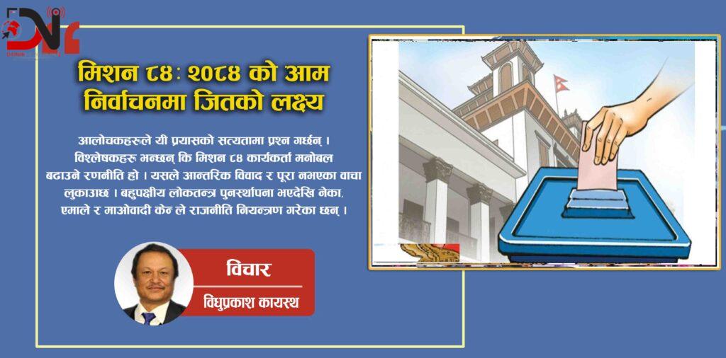 नेपाल २०८४ मङ्सिरसम्म हुने आम निर्वाचन नजिकिँदैछ । यो निर्वाचनले २७५ सदस्यीय प्रतिनिधिसभा निर्धारण गर्छ । यसले देशको शासन परिवर्तन गर्न सक्छ । आर्थिक अस्थिरता, भ्रष्टाचार र जनताको निराशा जस्ता चुनौतीहरू छन् । तयारीको केन्द्रमा ’मिशन ८४’ छ । यो विक्रम संवत् २०८४ को सन्दर्भ हो । प्रमुख राजनीतिक दलहरूले यो नारा अपनाएका छन् । यसले आधार मजबुत बनाउँछ । मतदाता जुटाउँछ र निर्णायक जित सुनिश्चित गर्छ । अब यो सबै प्रमुख खेलाडीहरूमा फैलिएको छ । तर यो राष्ट्रिय प्रगतिको लागि साँचो प्रयास हो कि राजनीतिक चाल हो भन्ने बहस छ ।