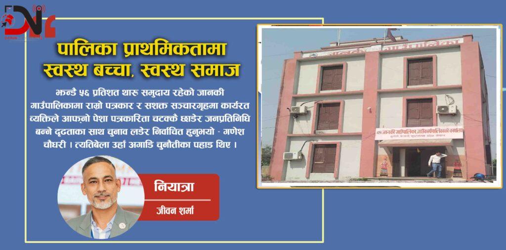 झन्डै ५६ प्रतिशत थारु समुदाय रहेको जानकी गाउँपालिकामा राम्रो पत्रकार र सशक्त सञ्चारगृहमा कार्यरत व्यक्तिले आफ्नो पेशा पत्रकारिता चटक्कै छाडेर जनप्रतिनिधि बन्ने दृढताका साथ चुनाव लडेर निर्वाचित हुनुभयो – गणेश चौधरी । त्यतिबेला उहाँ अगाडि चुनौतीका पहाड थिए । थारु बहुल समुदाय, त्यो पनि विभिन्न कारणले पछाडि परेको आफ्नै समुदायलाई अगाडि बढाउनु चट्टान फोर्नु जत्तिकै थियो । शिक्षा, स्वास्थ्य, रोजगारी, कृषि, सडक– अनेक विषयमा भएका बग्रेल्ती समाचार आफैं लेख्ने मान्छे । पत्रकारिता गर्दा समुदायका मसिना लाग्ने विषय पनि गहिरो अध्ययनसहित उठाउने उहाँ, आज स्थानीय सरकार प्रमुख भएको तीन वर्ष पुगिसकेको छ ।
