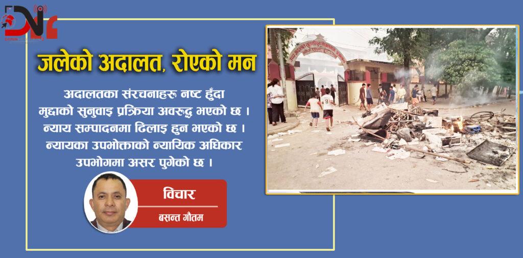 अदालतले के बिगारेको थियो होला । त्यहाँ भएका मुद्धाका मिसिल भौतिक सम्पत्ति किन जलाउनु परेको होला भनेर धेरै नै चिन्ता लाग्यो । मन स्तब्ध भयो । एक मनले सोचे न्यायिक काम कारवाही र न्यायिक सुशासन बारे चित्त नबुझेको भए ति बिषयमै आक्रमण गरे हुन्थ्यौ । प्रदर्शनकारीलाई मुद्धाका मिसिल, अदालती भवन, भौतिक चिजबस्तुले के बिगारेका थिए र ? आखिर बढी मर्का पर्ने ति निमुखा जनताई नै हो ।