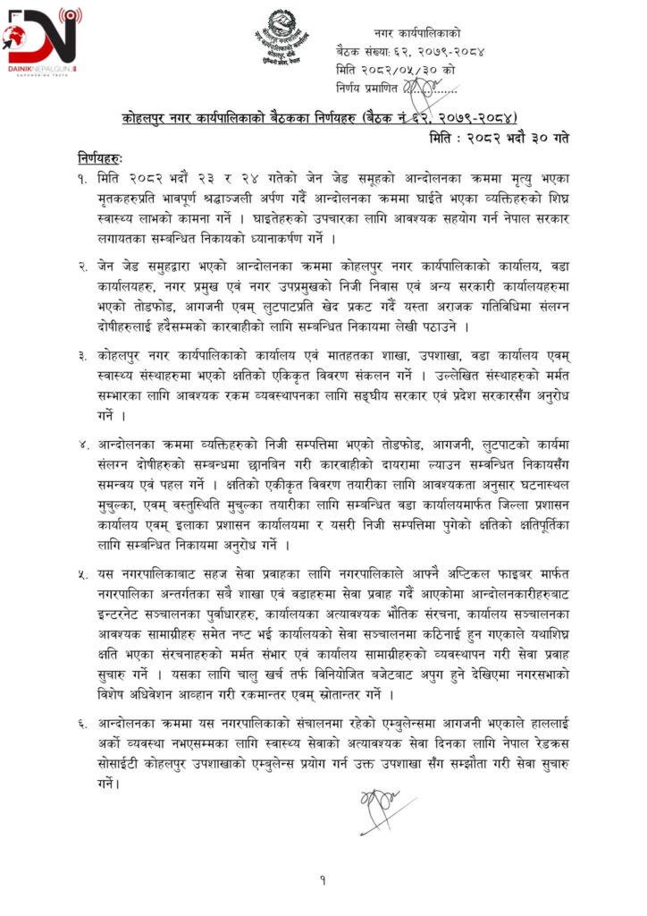 जेनजीको प्रदर्शनका क्रममा कार्यालयमा तोडफोड, आगजनीका कारण सेवा प्रवाह गर्न नसक्ने अवस्था आएपछि कोहलपुर कार्यपालिका बैठकले चालु खर्चका लागि रकमान्तर गर्न विशेष अधिवेशन आव्हान गर्ने निर्णय गरेको हो ।