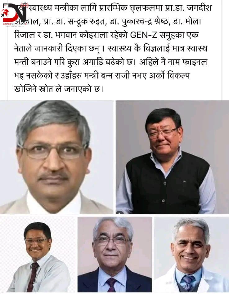 सामाजिक सञ्जालमा देखिएको एउटा बहसले दैनिक नेपालगन्जको ध्यान खिच्यो । जहाँ भेरी अस्पतालका पूर्व प्रमुख मेडिकल सुपेरिटेन्डेन्ट डा. गुणराज अवस्थी देखि अहिलेपनि कार्यरत वरिष्ठ चिकित्सक डा. वद्री चापागाईंसम्मको नाम नेतृत्वका लागि चर्चामा ल्याइएका छन् । चिकित्सक समुदायमै सीमित भएको चर्चा होइन, सर्वसाधारण नागरिकले ट्विटर÷एक्समा उनीहरुलाई ‘योग्य स्वास्थ्य मन्त्री’ को सम्भावित विकल्पका रूपमा देखेर आ–आफ्ना तर्क राखिरहेका छन् ।