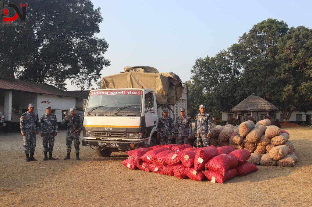 भन्सार छलेर भित्र्याइएको प्याज सशस्त्र प्रहरीले बरामद गरेको छ । सशस्त्र प्रहरी बल नेपाल नम्बर २९ गण हेक्डक्वाटर ज्वालामाई गण भालुबाङले आठ हजार किलो प्याज बरामद गरेको हो ।