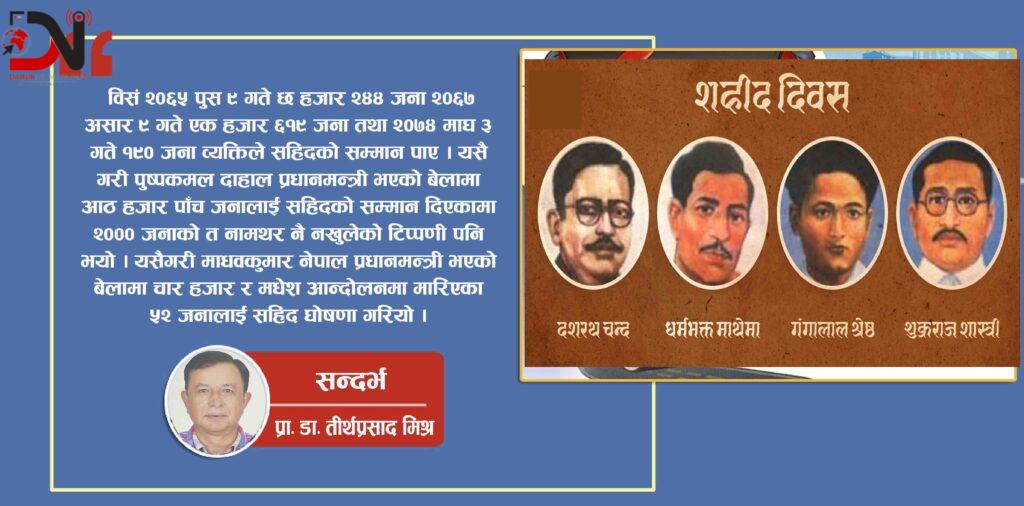 विसं २०४६ को आन्दोलन सफल भएपछि राजा महेन्द्रको २०१७ सालको काण्डको विरोधमा प्राणदण्ड पाएका र पञ्चायतको विरोधमा लागेकाको आरोपमा जीवन उत्सर्ग गरेकालाई सहिदको सम्मान दिइयो । यसमा जगतप्रकाशजङ्ग शाह, लालध्वज गुरुङ, दुर्गानन्द झा, तेजबहादुर अमात्य, सरोजप्रसाद कोइराला, भीमदत्त पन्त, रत्नकुमार बान्तवा, वीरेन्द्र राजवंशी, भीमनारायण श्रेष्ठ तथा यज्ञबहादुर बस्नेत आदिलाई सहिदको सम्मान दिइएको थियो । यसैगरी राणाविरोधी आन्दोलनमा मृत्युदण्ड पाएका लखन थापा तथा बाँकावीरलाई पनि सहिद घोषणा गरियो । यसैगरी २०४६ को आन्दोलनमा सहादत प्राप्त गर्ने १९ जनालाई सहिदको सम्मान प्रदान गरियो । २०६२÷६३ को आन्दोलनपश्चात् सहिद घोषणा र सम्मान कार्यमा निकै ठूलो भेल आएको देखिन्छ ।