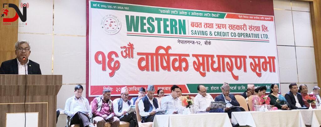 वेष्टर्न बचत तथा ऋण सहकारी संस्थाले आफ्नो १६औं बार्षिक साधारणसभा शुक्रबार आयोजना गर्यो । संस्थाका अध्यक्ष सञ्जय थापाको अध्यक्षमा भएको साधारणसभा उपाध्यक्ष अजय कुमार शर्मा, कानुनी सल्लाहकार प्रल्हाद बहादुर कार्की, सल्लाहकार श्याम बहादुर केसी, इश्वरी प्रसाद ज्ञवाली लगायतले संस्थागत विकासका विविध पक्षबारे सुझाव दिए ।