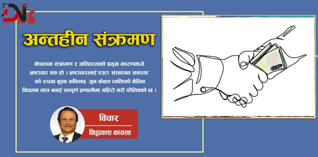 नेपालमा संक्रमण र अस्थिरताको प्रमुख कारणमध्ये भ्रष्टाचार एक हो । भ्रष्टाचारलाई एउटा “संस्थागत समस्या” को रूपमा बुझ्न सकिन्छ, जुन केवल व्यक्तिको नैतिक विचलन मात्र नभई सम्पूर्ण प्रणालीमा गहिरो गरी फैलिएको छ ।