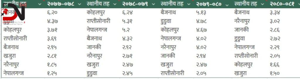 सोही आवमा नरैनापुर गाउँपालिकाको १.८५ प्रतिशत (१ करोड ९६ लाख ३२ हजार रुपैयाँ), खजुरा गाउँपालिकाको २.८१ प्रतिशत (५ करोड ८२ लाख ३३ हजार रुपैयाँ) र बैजनाथ गाउँपालिकाको २.९५ प्रतिशत (५ करोड ५९ लाख ५ हजार रुपैयाँ) बेरुजु थियो । साथै राप्तीसोनारी गाउँपालिकाको ३.६९ प्रतिशत (६ करोड ९९ लाख १२ हजार रुपैयाँ), कोहलपुर नगरपालिकामा ३.७१ प्रतिशत (८ करोड ८७ लाख ४५ हजार रुपैयाँ), डुडुवा गाउँपालिकामा ४.३७ प्रतिशत ( ५ करोड ८४ लाख ७४ हजार रुपैयाँ) र सबैभन्दा बढी जानकी गाउँपालिकामा ६.२० प्रतिशत (५ करोड १५ लाख ५० हजार रुपैयाँ बेरुजु थियो ।