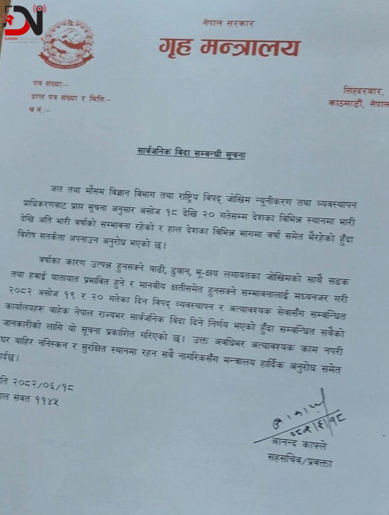 त्यसैअनुसार, नेपालगञ्जलगायत बाँके जिल्लामा बाढी, पहिरो र असिनासहितको भारी वर्षाको जोखिम रहने भन्दै आगामी दुई दिन (असोज १९ र २० गते) सार्वजनिक बिदा घोषणा गरिएको छ।
