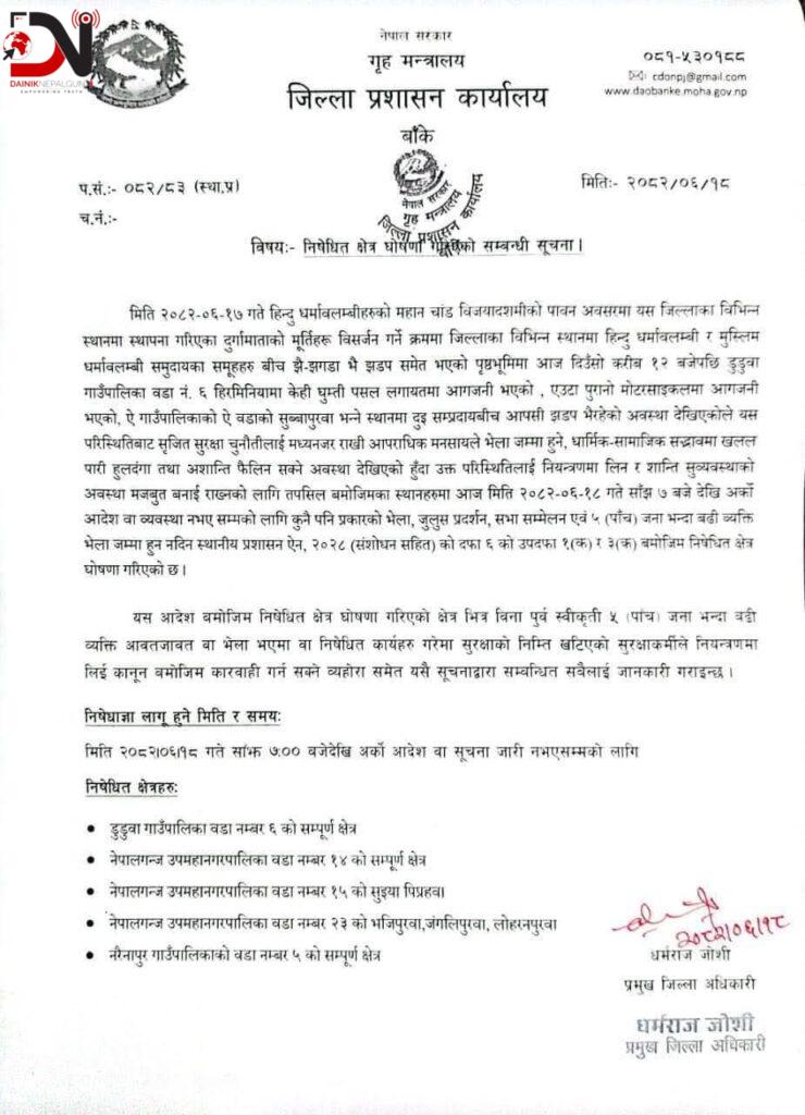 प्रमुख जिल्ला अधिकारी धर्मराज जोशीद्वारा हस्ताक्षरित सूचनाअनुसार, राति १२ बजे (असोज १८ गते) देखि अर्को आदेश जारी नभएसम्मका लागि निषेधाज्ञा लागू हुनेछ।