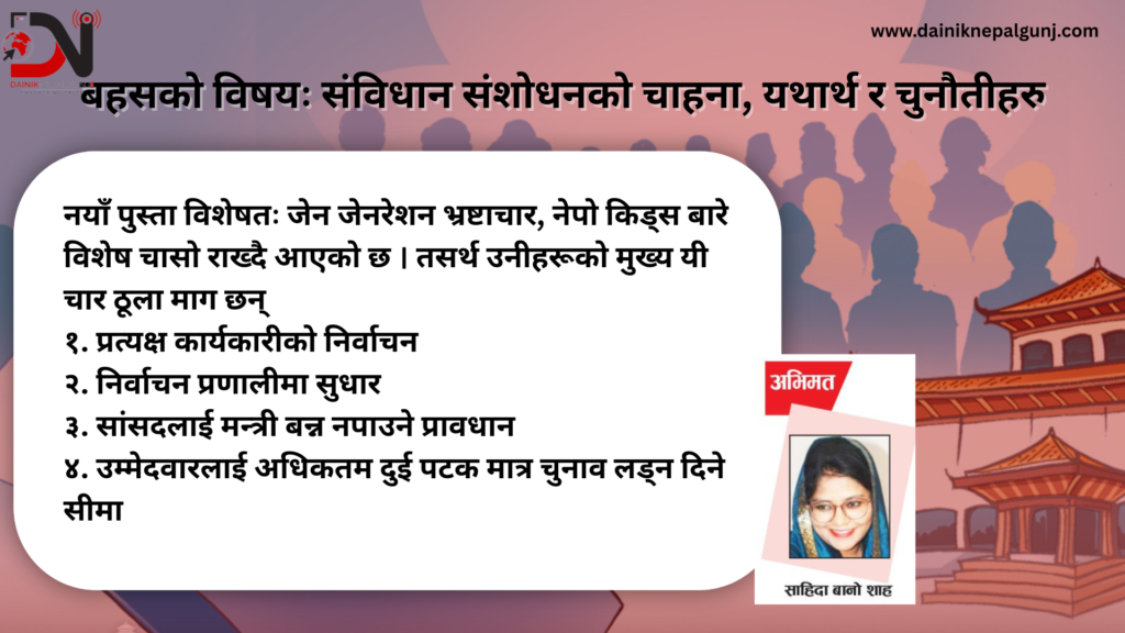 हो संविधान संशोधनको बहस आवश्यक छ, तर हाल सम्भव नरहेको मागलाई तत्काल पूरा गर्न खोज्दा संविधान नै अस्थिर बन्न सक्छ । अनि संविधान देशको एक ऐतिहासिक दस्तावेज हो, जुनकि पटक पटक फेर्न सम्भव छैन् । जेन जीको आवाज महत्त्वपूर्ण छ, यसले भविष्यको दिशा निर्देश गरेकोछ । संविधान संशोधन दीर्घकालीन सहमति र व्यावहारिक प्राथमिकतामा आधारित हुनुपर्छ । भारत जस्तो संघीय लोकतान्त्रिक मुलुकले पनि प्रत्यक्ष कार्यकारी, सांसदलाई मन्त्री बन्न नदिने वा कार्यकालमा सीमा राख्ने अभ्यास अंगालेको छैन् । त्यसैले नेपालले पनि यस्ता अभ्यासलाई तत्काल लागू गर्ने होइन्, सन्दर्भ अनुसार अध्ययन गर्ने मात्र बाटो खुला राख्नुपर्छ । संविधानलाई समय सापेक्ष परिमार्जन गर्दै लैजाने परिपाटी आवश्यक छ । यद्यपि यसले स्थायित्व, समावेशीता र लोकतान्त्रिक अभ्यासलाई कमजोर पार्ने खतरा छैन् भन्ने कुरा एकदमै सुनिश्चित हुनुपर्छ । संविधानलाई सुधार्ने काम राजनीतिक सहमति, नागरिक समाजको सहभागिता र जनताकै चाहनामा आधारित हुनुपर्छ । स्थायित्वका लागि लचिलोपन, समानता विकास र निकासको लागि सुधार । नेपालका लागि अहिलेको मूलमन्त्र हुन सक्छ ।