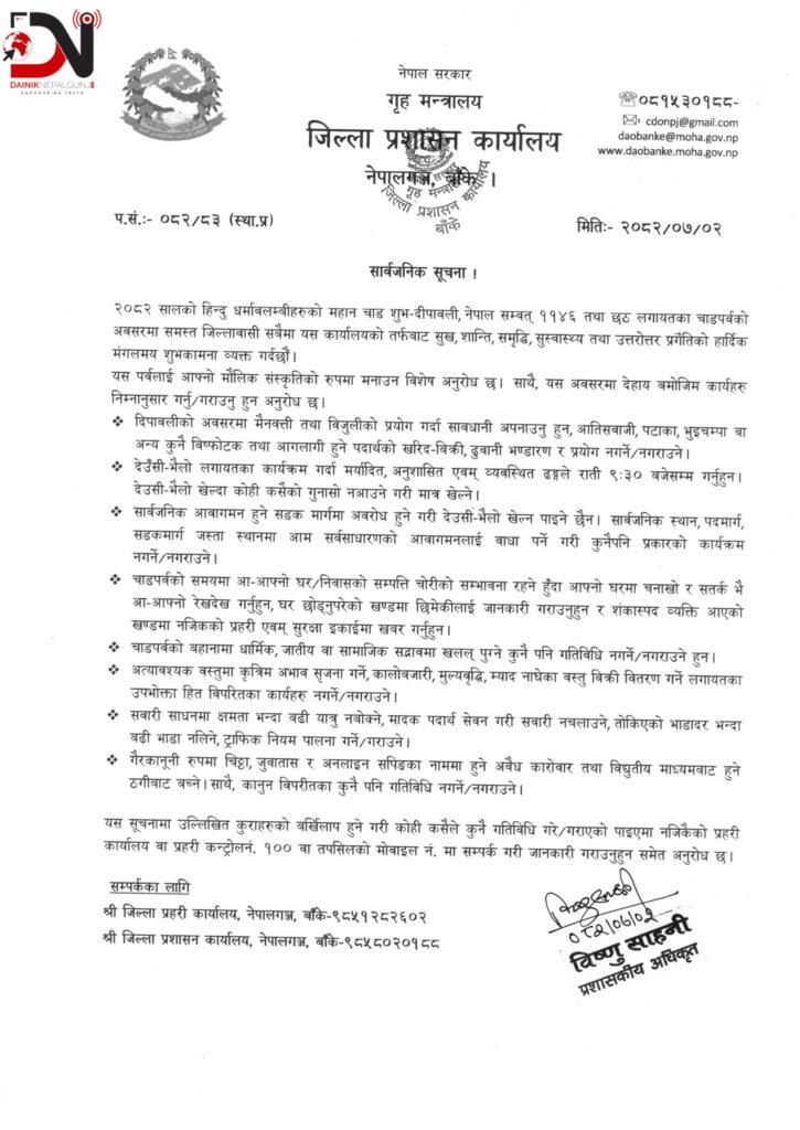 जिल्ला प्रशासन कार्यालय बाँकेले यस बर्ष दिपावलीका अवसरमा साढे ९ बजेसम्म देउसी–भैलो लगायतका कार्यक्रम गरिसक्न सार्वजनिक सूचना जारी गरेको छ ।