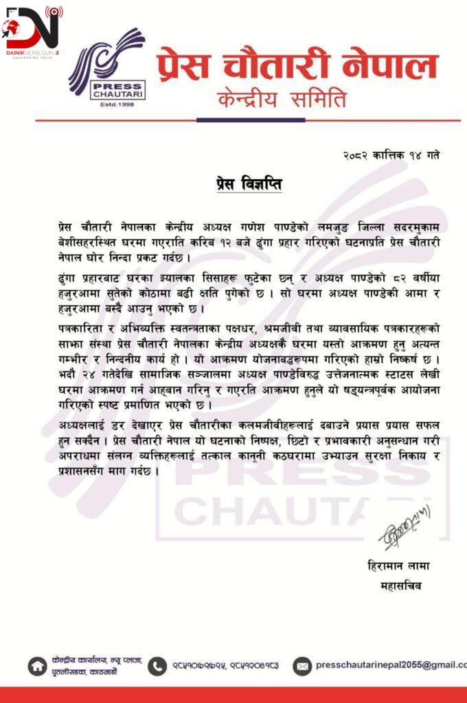 विज्ञप्तिमा भनिएको छ, “अध्यक्षलाई डर देखाएर प्रेस चौतारीका कलमजीवीहरूलाई दबाउने प्रयास सफल हुन सक्दैन।”