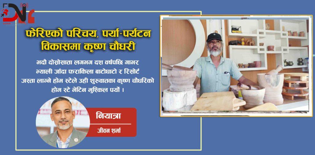 कृष्ण चौधरीको परिचय अहिले होम स्टे सन्चालन र काठको सामान मात्रै बनाउनेमा मात्रै सिमित छैन, बैजनाथ गाउपलिका १ मा पर्ने गाभर भ्याली मध्यवर्ती क्षेत्र भित्र पनि पर्छ, त्यसैले उन्ले समुदाय र यहाँको बिकास समीतिसंग मिलेर पर्यापर्यटन बिकासमा लागेका छन् । यो भनेको उनि जनावर ÷ जिवजन्तुसंगसङ्ग संघर्ष मात्रै गर्दैनन त्यहीलाई आम्दानीका रूपमा लिनापर्छा भनेर काम पनि गरिरहेका छन् । समुदायसङ्ग मिलेर आन्तरिक पर्यटन प्रवद्र्धन गर्न लागि परेका छन । यसैको लागि यहाँ जैबिक पार्क बनाईएको छ त्यस्तै पर्यटन प्रवर्धनमा मिश्रीत समुदाय भएकोले पनि फरक छ । यहाँ आएर बस्ने खाने पर्यटकले भिन्नै स्वादको अनुभव गर्दछन । पर्या–पर्यटनलाई बिकास गर्न कृषि र आनुबाङ्शिक बिबिधितालाई समेटन अहिले सबैजना लागि परेका छन सामुदायिक जिन बैङ्कका रूपमा बिकासको काम गरिरहेको समितीले यस्लाई ब्यबसायको रूपमा बिकास गर्ने लक्ष्य लिएको छ । गाभर भ्याली अबको दशक भित्र अध्ययन÷अनुशन्धान केन्द्र बनाउन लागि परेको छ है, हिड्ने बेलामा कृष्ण जीले सुनाउन भ्याउनु भयो ।