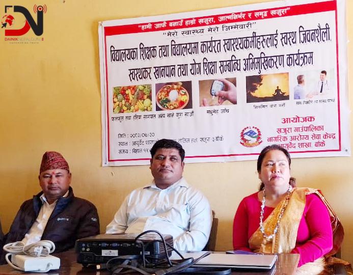बाँकेको खजुरामा विद्यालयका शिक्षक तथा विद्यालयमा कार्यरत स्वास्थ्यकर्मीहरूलाई स्वस्थ जीवनशैली, स्वस्थकर खानपान तथा योग शिक्षा सम्बन्धी अभिमूखिकरण गरिएको छ ।