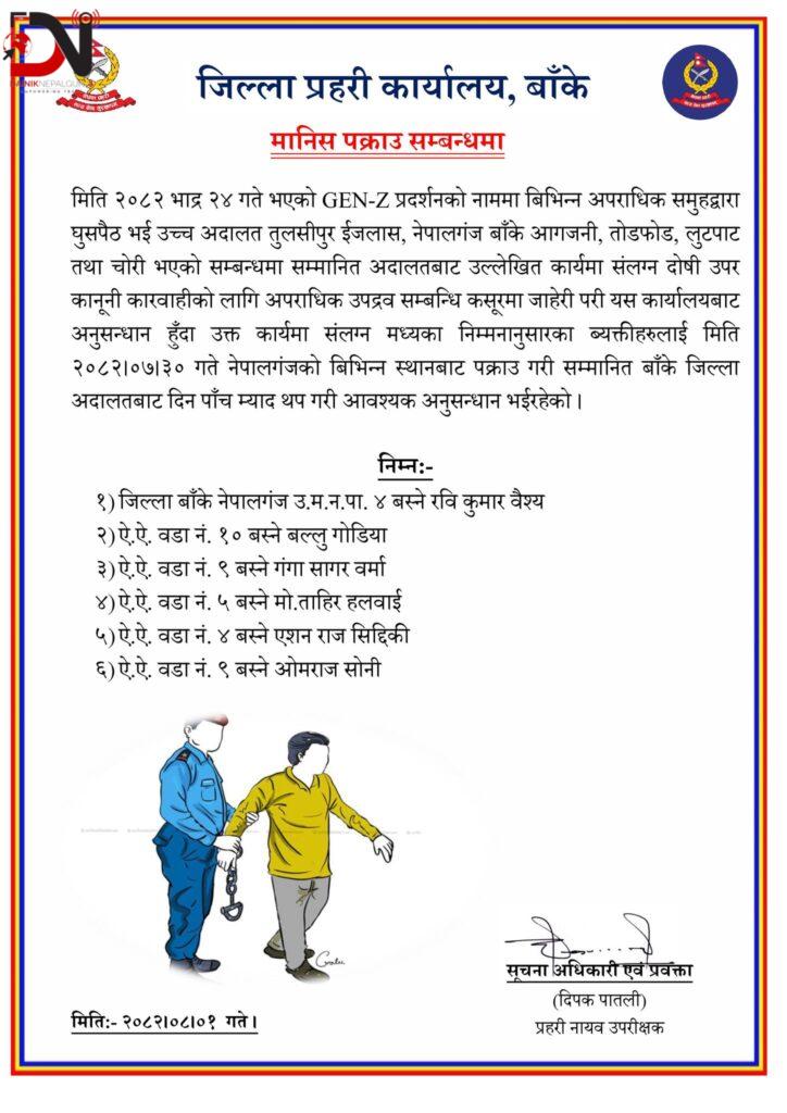 जिल्ला प्रहरी कार्यालय, बाँकेका अनुसार, अदालतमा दर्ता भएको अपराधिक उपद्रव सम्बन्धी कसूरको जाहेरीका आधारमा अनुसन्धान अघि बढाइएको हो । अनुसन्धानकै क्रममा नेपालगन्जका विभिन्न स्थानबाट छ जना व्यक्तिहरूलाई पक्राउ गरिएको प्रहरी नायव उपरीक्षक तथा सूचना अधिकारी दिपक पातलीले जानकारी दिएका छन् ।