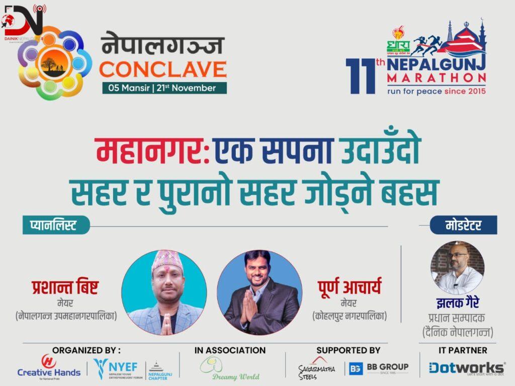 आज विहीवारदेखि नेपालगन्ज कनक्लेव हुने भएको छ । आज पहिलो बहस महानगर सपनासँग जोडिएर गरिंदैछ । महानगर एक सपनाः उदाउँदो र पुरानो सहर जोड्ने प्रयास शिर्षकमा नेपालगन्ज उपमहानगरपालिका नगर प्रमुख प्रशान्त विष्ट र कोहलपुर नगरपालिकाका प्रमुख पूर्ण आचार्यबीच दैनिक नेपालगन्जका प्रधानसम्पादक झलक गैरेले संवाद गर्दैछन् ।