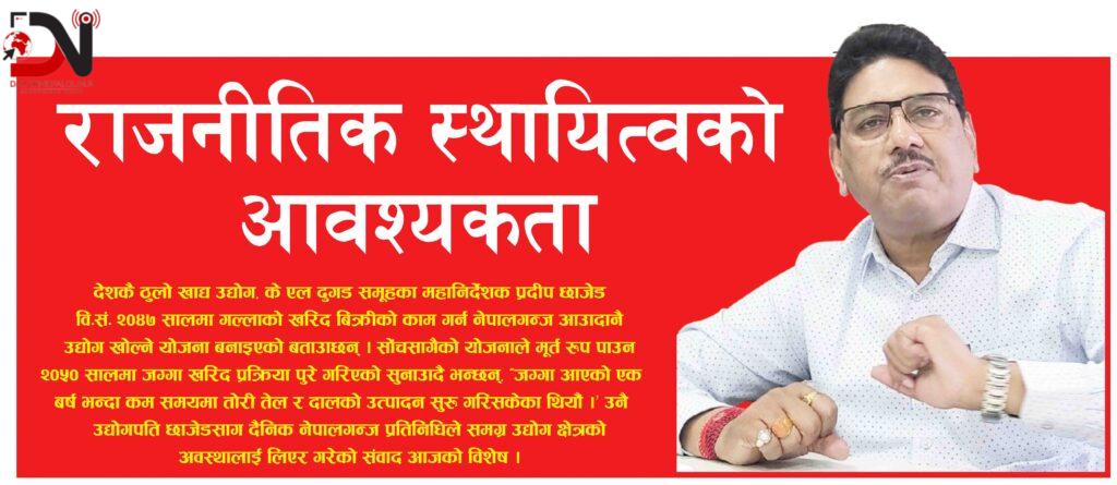 देशकै ठुलो खाद्य उद्योग, के एल दुगड समूहका महानिर्देशक प्रदीप छाजेड वि.सं. २०४७ सालमा गल्लाको खरिद बिक्रीको काम गर्न नेपालगन्ज आउँदानै उद्योग खोल्ने योजना बनाइएको बताउँछन् । सोंचसँगैको योजनाले मूर्त रुप पाउन २०५० सालमा जग्गा खरिद प्रक्रिया पुरे गरिएको सुनाउँदै भन्छन्, ‘जग्गा आएको एक बर्ष भन्दा कम समयमा तोरी तेल र दालको उत्पादन सुरु गरिसकेका थियौं ।’ उनै उद्योगपति छाजेडसँग दैनिक नेपालगन्ज प्रतिनिधिले समग्र उद्योग क्षेत्रको अवस्थालाई लिएर गरेको संवाद आजको विशेष ।