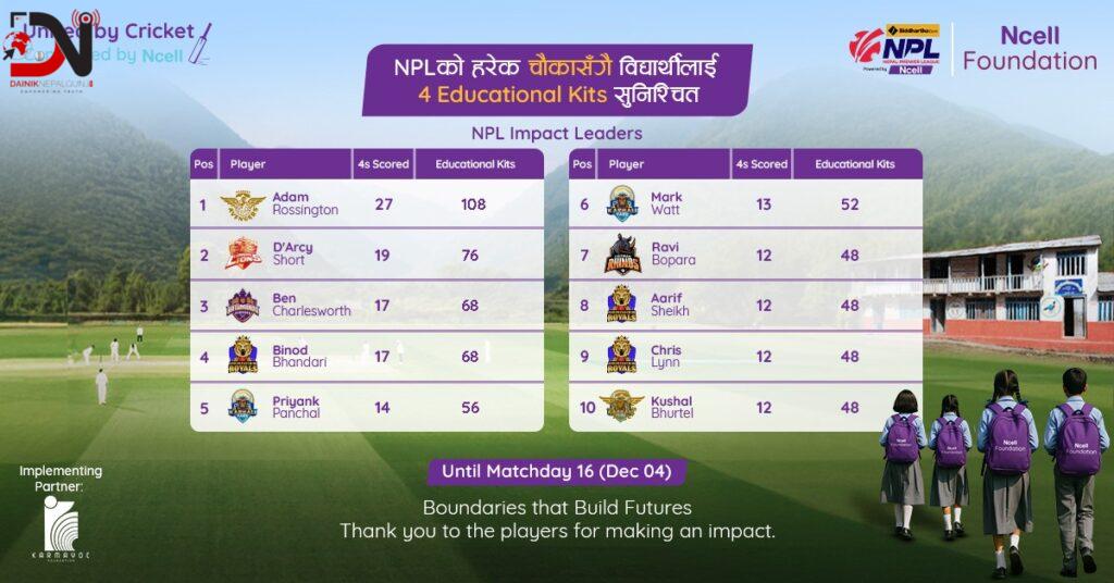 हिजो बिहीबार (मंसिर १८)सम्म खेलिएका एनपीएल सिजन २ का खेलहरुमा ९० खेलाडीहरूले कुल ५१० चौका प्रहार गरेका छन्, जसले २,०४० शैक्षिक सामग्रीहरुको वितरण सुनिश्चित गरेका छ । चौका प्रहार गर्ने शीर्ष तीन खेलाडीहरूको सूचीमा पोखरा अवेन्जर्सका एडम रोसिङटन २७ चौकासहित अगाडि छन् जसले १०८ शैक्षिक सामग्री वितरण सुनिश्चित गरेका छन् । लुम्बिनी लायन्सका डार्सी सर्ट १९ चौकासहित दोस्रो स्थानमा रहेर ७६ शैक्षिक सामग्री योगदान गरेका छन् । त्यसैगरी काठमाडौँ गोर्खाजका बेन चाल्र्सवर्थ र सुदूरपश्चिम रोयल्सका बिनोद भण्डारी तेस्रो स्थानमा छन्, उनीहरुले १७–१७ चौका प्रहार गर्दै प्रत्येकले ६८ शैक्षिक सामग्री वितरण सुनिश्चित गरेका छन्।