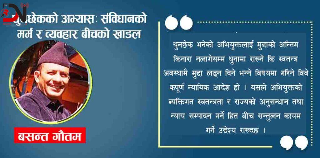 संविधानका प्रावधान, सर्वोच्च अदालतका प्रतिपादित सिद्धान्त र नेपाल पक्ष भएका अन्तर्राष्ट्रिय कानुनको प्रभावकारी कार्यान्वयन बिना फौजदारी न्याय प्रणाली सुदृढ हुन सक्दैन । थुनछेक सम्बन्धी कानुनमा आवश्यक संशोधन र असल अभ्यासको विकास गर्दै “पहिले सुन्ने, प्रमाण हेर्ने र अन्तिम विकल्पका रूपमा मात्र थुन्ने” संस्कृतिको स्थापना आजको अपरिहार्य आवश्यकता हो । यस तर्फ समयमै संवेदनशीलता नदेखाए फौजदारी न्याय प्रणाली माथि जनविश्वास झन् कमजोर हुँदै जाने खतरा रहन्छ । (लेखक अधिवक्ता हुनुहुन्छ ।)