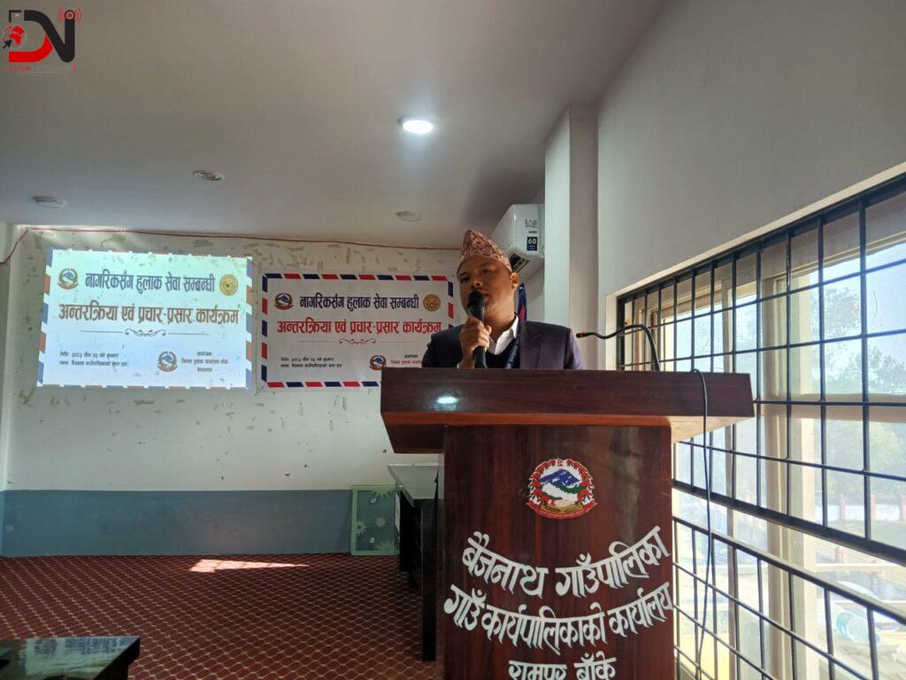 हुलाक सेवाप्रति आम नागरिकको पहुँच, विश्वास र उपयोग बढाउने उद्देश्यले आयोजित कार्यक्रममा बैजनाथ गाउँपालिकामा रहेका सबै प्रकारका बैंक, लघुवित्तीय संस्था, सहकारी, सरकारी कार्यालयका प्रतिनिधि, सरकारी तथा गैरसरकारी विद्यालयका प्रधानाध्यापक एवं प्रतिनिधि, गाउँकार्यपालिकाका शाखा प्रमुखलगायत सरोकारवाला बौद्धिक व्यक्तित्वहरूको उल्लेख्य उपस्थिति रहेको थियो ।