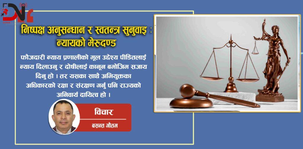 अन्तमा, स्वतन्त्र सुनुवाइ र निष्पक्ष अनुसन्धान कुनै एक निकायको जिम्मेवारी मात्र होइन । प्रहरीको निष्पक्ष अनुसन्धान, सरकारी वकिलको वस्तुनिष्ठ अभियोजन, अदालतको स्वतन्त्र निर्णय, कानून व्यवसायीको प्रभावकारी प्रतिरक्षा, कारागार प्रशासनको मानवोचित व्यवहार, सञ्चार माध्यमको जिम्मेवार प्रस्तुति र नागरिक समाजको निगरानी—यी सबैको समन्वयबाट मात्र न्याय प्रणाली सुदृढ हुन्छ । जब सरोकारवालाहरूले आ–आफ्नो भूमिकालाई इमान्दारी, व्यावसायिकता र मानव अधिकार प्रतिको संवेदनशीलता सहित निर्वाह गर्छन्, तब मात्र स्वच्छ, निष्पक्ष र जनविश्वासयोग्य फौजदारी न्याय प्रणाली स्थापित हुन सक्छ । (लेखक अधिवक्ता हुन ।)