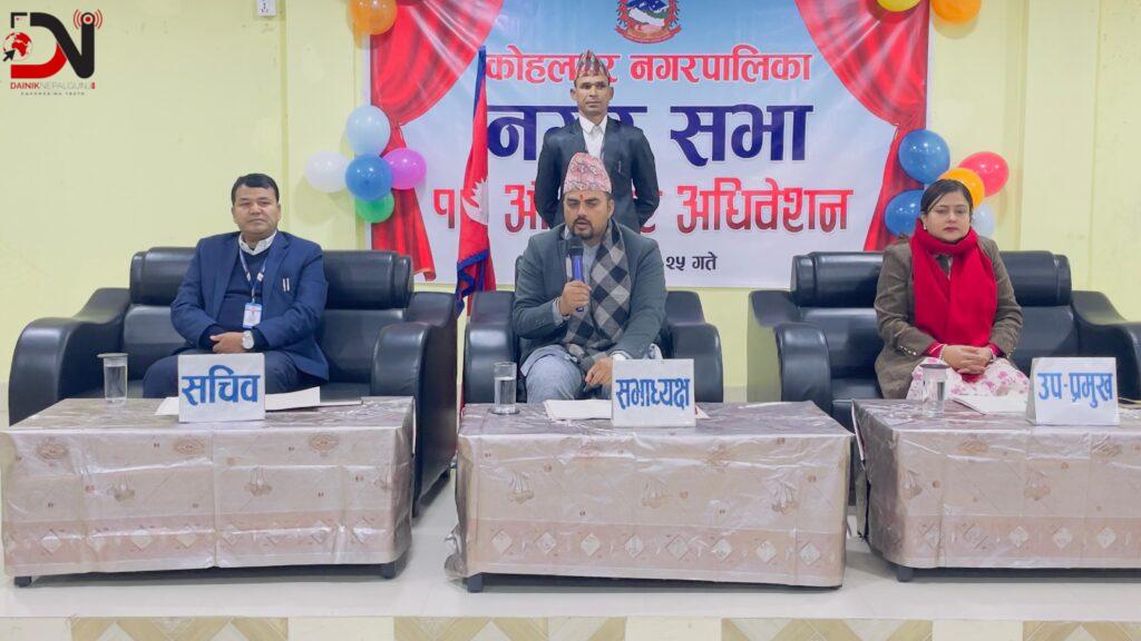 यस्तै नगरसभाले कोहलपुर नगरापालिकाको कर्मचारी संगठन संरचना संशोधनसहित पारित गरेको छ । उन्नाइसौं नगरसभामा नगर उपप्रमुख संगिता सुवेदीद्धारा प्रस्तुत प्रगति समीक्षा र संशोधित बजेट पनि पारित भएको प्रमुख प्रशासकीय अधिकृत तथा सभाका सदस्य सचिव मानबहादुर गिरीले जानकारी दिए । हालसम्म विनियोजित बजेटमध्ये २८ प्रतिशत खर्च भएको छ । चालू आर्थिक वर्षका लागि विनियोजित कुल बजेट १ अर्व १७ करोड ४५ लाख ५ हजार मध्ये ३३ करोड ५० लाख एक हजार ८४ रुपैयाँ १४ पैसा खर्च भइ कुल बजेटको २८.४९ प्रतिशत बजेट खर्च भएको हो ।