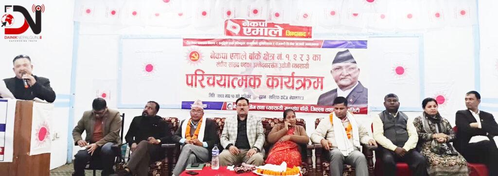 बाँके क्षेत्र नं. १ का उम्मेदवार सुर्य ढकालले एमालेको नेतृत्वमा बाँकेमा भएको विकास निर्माणका कार्यहरू व्यवसायी माझ राख्दै एमाले राष्ट्रवादी पार्टी भएको र जनतासँग जोडिएर अगाडि बढ्ने बताए । ढकालले बाँकेका तीन वटै क्षेत्रमा एमाले नेतृत्वको सरकार हुँदा भएका विकास, निर्माणका कामको मूल्यांकन जनताले गरेर मतदात गर्ने विश्वास व्यक्त गरे ।