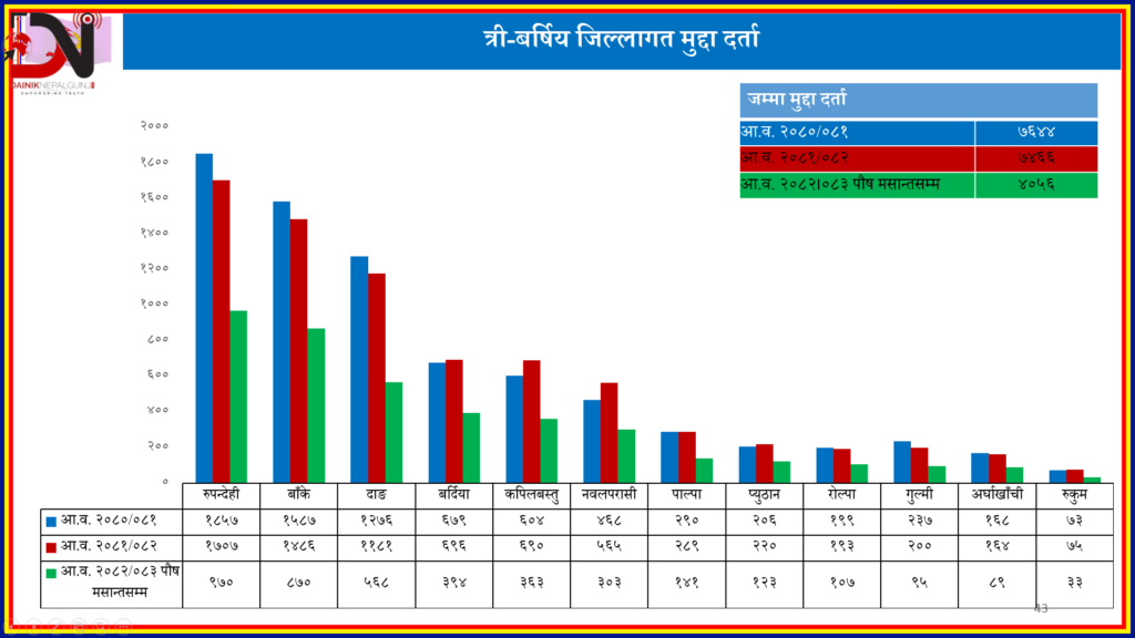 लुम्बिनी प्रदेशका १२ जिल्लामा पछिल्ला तीन आर्थिक वर्षमा मुद्दा दर्ताको संख्या उल्लेखनीय रूपमा परिवर्तन भएको छ । प्रदेश प्रहरी कार्यालयको तथ्यांकअनुसार सबैभन्दा धेरै मुद्दा रूपन्देहीमा दर्ता भएको छ भने सबैभन्दा कम रुकुम पश्चिममा दर्ता भएको देखिन्छ ।