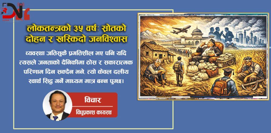 वि.सं. २०४६ सालको जनआन्दोलनले नेपालमा बहुदलीय प्रजातन्त्रको पुनःस्थापना गर्यो। त्यसबेला नेपाली नागरिकका आँखामा एउटा सुन्दर र समृद्ध नेपालको सपना थियो। त्यसयताका ३५ वर्षमा हामीले धेरै राजनीतिक प्रयोगहरू गर्यौँ। हामी संवैधानिक राजतन्त्रबाट गणतन्त्रमा गयौँ। एकात्मक राज्य प्रणालीबाट संघीयतामा प्रवेश गर्यौँ। आज २०८२ सालमा उभिएर हेर्दा एउटा गम्भीर प्रश्न उब्जिन्छ— के नेपालमा लोकतन्त्र केवल एउटा महँगो उत्सव मात्र बनेको हो? विगत ३५ वर्षमा हामीले प्रणाली फेर्न जति समय र स्रोत खर्च गर्यौँ, त्यसको तुलनामा आम नागरिकको जीवनस्तरमा आएको सुधार भने अत्यन्तै निराशाजनक छ।