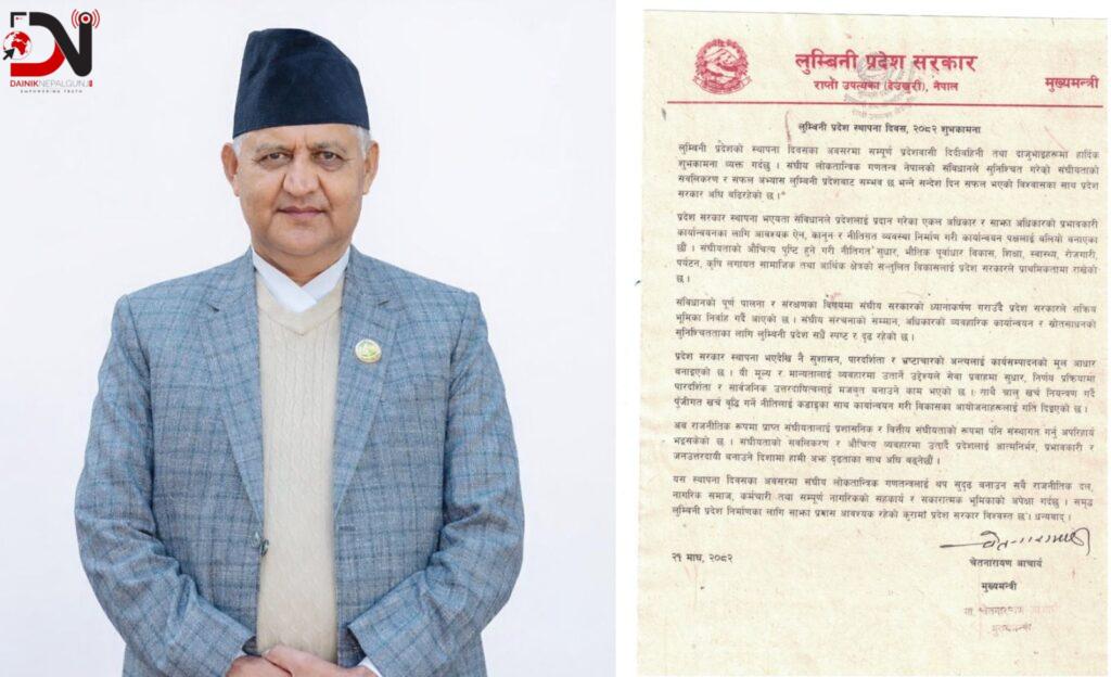 लुम्बिनी प्रदेशका मुख्यमन्त्री चेतनारायण आचार्यले संघीयताको सवलिकरण र सफल अभ्यास लुम्बिनी प्रदेशबाट सम्भव भएको सन्देश देशभर दिन सफल भएको बताउनुभएको छ । प्रदेश स्थापना दिवसको अवसरमा बुधवार एक शुभकामना सन्देश जारी गर्दै मुख्यमन्त्री आचार्यले प्रदेशलाई आत्मनिर्भर, प्रभावकारी र जनउत्तरदायी बनाउने दिशामा सरकार दृढताका साथ अघि बढिरहेको स्पष्ट पार्नुभएको हो ।