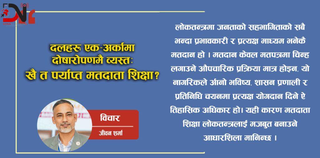 यस्तो अवस्थामा निर्वाचन लक्षित मतदाता शिक्षा अत्यन्त कमजोर अवस्थामा रहेको तथ्य गम्भीर चिन्ताको विषय बनेको छ। म मतदान किन गर्दैछु? मतदानले के परिवर्तन ल्याउँछ? मतदान अधिकार किन महत्वपूर्ण छ? मतदाताले कुन आधारमा निर्णय लिनुपर्छ? यस्ता आधारभूत प्रश्नमा न त राजनीतिक दलहरूको ध्यान पुगेको देखिन्छ, न उम्मेदवारहरूकै प्राथमिकतामा यो विषय परेको छ। मतदाता शिक्षाको अभाव लोकतन्त्रकै जरा कमजोर पार्ने विषय हो, तर यसतर्फ गम्भीर बहस र हस्तक्षेप भएको देखिँदैन।