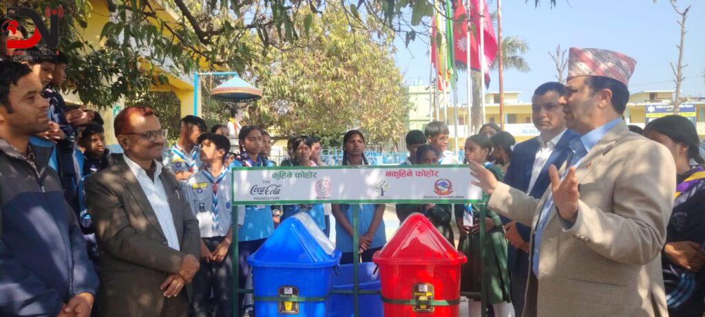 द कोकाकोला फाण्डेसनको आर्थिक सहयोग बास नेपाल र स्वच्छ सफा नेपाल दवारा सञ्चालित ग्रीन नेपालगन्ज ः सामुदायिक फोहोर रुपान्तरण परियोजना अन्तर्गत नेपालगन्ज उपमहानगरपालिका भित्रका शुन्य फोहोर विद्यालय कार्यक्रम संचालन भएका बिद्यालयहरुमा सो डस्टबिन बितरण गरिएको परियोजना संयोजक मन भण्डारीले बताए ।
