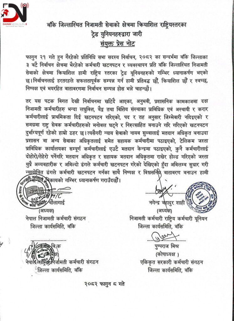 बाँकेमा आसन्न प्रतिनिधिसभा निर्वाचनका लागि झण्डै २ हजार ५ सय कर्मचारी परिचालन हुने भएका छन् । त्यसका लागि जिल्ला निर्वाचन व्यवस्थापन समितिले आवश्यक निर्णय गरेको हो । मुख्य निर्वाचन अधिकृत कार्यालयको नेतृत्वमा जिल्लाका तीन वटै निर्वाचन क्षेत्रका ४ सय बढी मतदान बढी मतदान केन्द्रमा २ हजार ४ सय १५ जना कर्मचारी परिचालन हुने भएका हुन् । ‘त्यसका लागि आवश्यक निर्णय भएर कार्यान्वयन प्रक्रियामा जाँदैछ’, जिल्ला निर्वाचन व्यवस्थापन समितिका सदस्य सचिव समेत रहेका निर्वाचन कार्यालय बाँकेका प्रमुख टेक बहादुर शाहीले दैनिक नेपालगन्जसँग भने । बाँकेमा एक सय ३९ मतदानस्थलमा ४०० मतदान केन्द्र कायम गरिएको निर्वाचन कार्यालय बाँकेले जनाएको छ ।यसैबीच, निर्वाचनका क्रममा कर्मचारी परिचालनको विषयलाई लिएर असन्तुष्टि सार्वजनिक भएको छ । जिल्ला स्थित निजामति सेवाको क्षेत्रमा क्रियाशिल राष्ट्रिय स्तरको टे«ड यूनियनहरूले शुक्रबार संयुक्त विज्ञप्ति मार्फत उक्त असन्तुष्टि सार्वजनिक गरेका हुन् । ‘सकेसम्म यी असन्तुष्टि बाहिर ल्याउन चाहँदैनथियौं’, एक जना कर्मचारी नेताले भने, ‘सुनुवाईमा पटक्कै ध्यान नगएपछि बाध्य भएर वक्तव्य जारी गर्नुपर्यो ।’ उनका अनुसार, निजामति कर्मचारीलाई बेवास्ता हुनेगरी कम्पनी र विभिन्न संस्थानका कर्मचारीहरूलाई समेत परिचालन गरेपछि असन्तुष्टि संगठित रूपमा बाहिर आएको हो । ‘विद्युत र खानेपानीका मिटर रिडरलाई निर्वाचनमा परिचालन गरिएको छ’, कर्मचारी नेताको भनाइ छ, ‘निजामति सेवाबाट भरपूर सहयोग गर्ने प्रतिबद्धता हुँदाहुँदै मनपरी ढंगले काम भएपछि असन्तुष्टि बाहिरिएको हो ।’टे«ड यूनियनहरूले संयुक्त प्रेस नोट मार्फत भनेका छन्, ‘न्याय सेवाको नायब सुब्बालाई मतदान अधिकृत बनाउँदा प्रशासन वा अन्य सेवाका अधिकृतलाई समेत सहायक कर्मचारीमा पठाइएको, टेलिकम जस्ता प्राविधिक कार्यालयका सम्पूर्ण कर्मचारीलाई एउटै मतदान केन्द्रमा पठाइएको, कुनै कर्मचारीलाई दोहोरो, तेहोरो पर्ने गरी मतदान अधिकृत र सहायक मतदान अधिकृतमा राखेर होल्ड गरिएको जस्ता थुप्रै अव्यवहारिक र अमिल्दो ढंगले कर्मचारी खटनपटन गरिएको दिएको हुँदा अविलम्व सुधार गरी न्यायोचित ढंगले कर्मचारी खटनपटन गर्नका साथै निष्पक्ष र विश्वसनीय वातावरण बनाउनका लागि गम्भीर ध्यानाकर्षण गरिएको छ ।’ नेपाल निजामति कर्मचारी संगठन बाँकेका अध्यक्ष देविलाल चौलागाई, निजामति कर्मचारी राष्ट्रिय कर्मचारी यूनियन बाँकेका अध्यक्ष नगेन्द्र बहादुर शाही, नेपाल राष्ट्रिय निजामति कर्मचारी संगठनका अध्यक्ष हुर्मत विक र एकीकृत सरकारी कर्मचारी संगठन बाँके तर्फबाट कोषाध्यक्ष पुष्पराज मिश्रले जारी रहेको संयुक्त प्रेस 