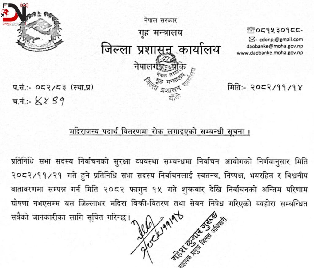 जिल्ला प्रशासन कार्यालय बाँकेले आज शुक्रबारदेखि निर्वाचनको अन्तिम मत परिणाम घोषणा नहुँदासम्मका लागि मदिराजन्य पदार्थ बिक्री–वितरण तथा सेवन निषेध गरेको छ । मदिराजन्य पदार्थको बिक्री, वितरण सेवनले निर्वाचनमा असर पार्न सक्ने, अवाञ्छित गतिविधि र अमर्यादित क्रियाकलाप हुनसक्ने आशंकामा केन्द्रीय निर्णय अनुसार नै मदिराजन्य पदार्थ निषेध गरिएको बताइन्छ ।