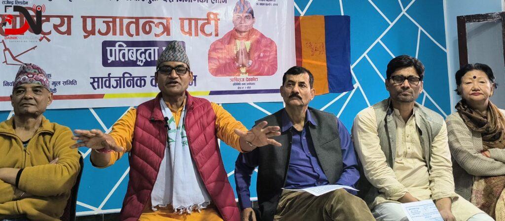 आसन्न प्रतिनिधि सभा निर्वाचन केन्द्रित गर्दै बाँके निर्वाचन क्षेत्र नम्बर २ मा राष्ट्रिय प्रजातन्त्र पार्टी (राप्रपा) का उम्मेदवार ऋषिराज देवकोटाले २६ बुँदे प्रतिबद्धता सार्वजनिक गरेका छन् ।