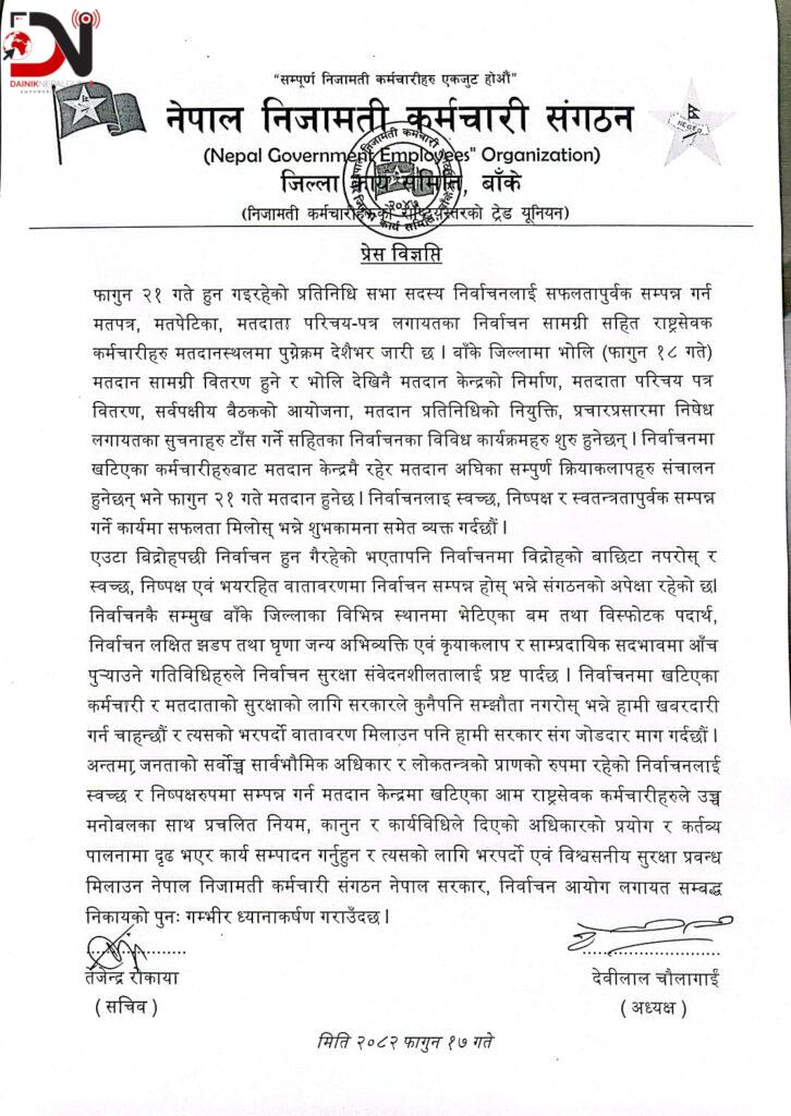 संगठनका अध्यक्ष देवीलाल चौलागाईं र सचिव तेजेन्द्र रोकायाद्वारा हस्ताक्षरित विज्ञप्तिमा बाँके जिल्लामा फागुन १८ गतेदेखि मतदान सामग्री वितरण हुने तथा सोही दिनदेखि मतदान केन्द्र निर्माण, मतदाता परिचय–पत्र वितरण, सर्वपक्षीय बैठक आयोजना, मतदान प्रतिनिधि नियुक्ति, प्रचार–प्रसार निषेधसम्बन्धी सूचना टाँस गर्ने लगायतका कार्यक्रम सुरु हुने उल्लेख गरिएको छ । निर्वाचनमा खटिएका कर्मचारीहरूले मतदान केन्द्रमै रहेर मतदान अघिका सम्पूर्ण क्रियाकलाप सञ्चालन गर्ने र फागुन २१ गते मतदान हुने जनाइएको छ ।