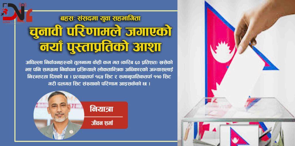 तर अहिले संसदमा युवाहरूको उल्लेखनीय सहभागिताले भविष्यप्रति केही सकारात्मक संकेत पनि दिएको छ । यदि अब बन्ने सरकार र संसदले रोजगारी सिर्जना, शिक्षामा आमूल सुधार, प्रविधि विकास, कृषि आधुनिकीकरण र उद्यमशीलता प्रवद्र्धन जस्ता विषयलाई प्राथमिकतामा राख्न सके भने यसको प्रत्यक्ष लाभ युवा पुस्ताले नै पाउनेछ । त्यसैले पनि युवा सहभागितालाई आशाको केन्द्रका रूपमा हेरिएको छ ।