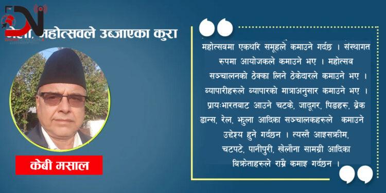 मुलुकभर नै मेला र महोत्सवमा मानिसमा जुन आकर्षण र चासो हुनुपर्दथ्यो । त्यो कम हुन थालेको छ । सबैतिरबाट महोत्सवका बारेमा टिका टिप्पणी र गुनासो आउन थालेको छ । यसको एउटा मात्रै कारण हो, मेला र महोत्सव जिल्लाको धेरै ठाउमा हुनु र जहाँ पायो त्यहाँ आयोजना हुनु । महोत्सव आयोजना गर्न होडबाजी नै चल्नु । आवश्यकताले भन्दा अस्वस्थ प्रतिस्पर्धा र रहरले महोत्सव सञ्चालन गर्नु जस्ता कुराहरू छन । कतिपय स्थानमा रहर, फेसन र अस्वस्थ प्रतिस्पर्धाको रूपमा मेला महोत्सव आयोजना हुन्छन त्यो राम्रो होइन । अब मेला र महोत्सव भनेको एउटा जिल्लामा एउटा मात्र हुनु पर्दछ । तब मात्र त्यसको गरिमा बढछ । आयोजकको पनि लक्ष्य पुरा हुन्छ । दर्शकले पनि फरक अनुभूति पाउँछन । नगर, गाउँपालिका र टोलैपिच्छे मेला र महोत्सव हुँदा यसले कसैलाई फाइदा गर्दैन । उल्टै श्रम र रोजगार गर्ने व्यक्तिको समयलाई बर्बाद गराउँछ । आयआर्जनमा सामेल हुने मान्छे पनि बेकारमा समय खेर फाल्न बाध्य हुन्छ । वास्तवमा भन्ने हो भने समय र पैसा दुवै बर्बाद हुन्छ । यसकारण अस्वस्थ प्रतिस्पर्धा गरी महोत्सव आयोजना गर्ने परम्परा अन्त्य हुनु पर्दछ । फरक फरक आयोजकले फरकफरक स्थानमा मेला महोत्सव आयोजना गर्ने होइन । गरिँदै आएको महोत्सवलाई फरक ढंगले संचालन गर्नू समयको माग हो । अब जिल्लामा मात्र एउटा महोत्सव हुनु पर्दछ ।