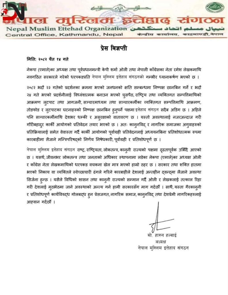 संगठनका केन्द्रीय अध्यक्ष मो. हारुन हलवाईले प्रेस विज्ञप्ति जारी गरेर अध्यक्ष ओली र पूर्व गृहमन्त्रीलाई तत्काल रिहाइको माग गरेको छ ।